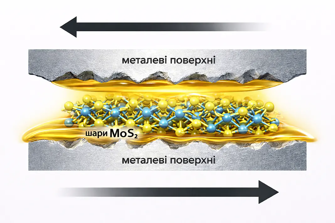 Саме ця речовина формує на поверхні металу спеціальну трибоплівку, яка значно знижує коефіцієнт тертя. Структура MoS₂ має шарувату будову, і ці шари легко ковзають один відносно одного. Завдяки цьому навіть у режимі граничного тертя поверхні можуть ковзати без прямого контакту металу.