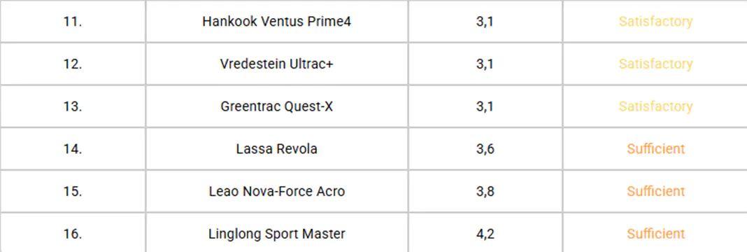 Цього року в тесті літніх шин ADAC брало участь 16 моделей. Лідерами очікувано стали преміальні продукти. Три перші місця посіли моделі від Continental, Pirelli та Goodyear, і лише ці три моделі отримали оцінку «Добре». Відразу за ними, з оцінкою «Задовільно», розташувалися моделі середнього класу від Firestone та Falken. Така ж оцінка була присвоєна ще 8 моделям шин, і лише три моделі отримали «Достатньо». І жодна шина не була класифікована як «Незадовільно».