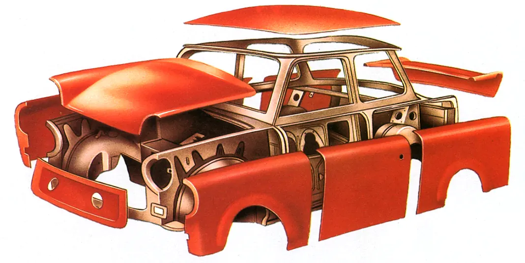 Звідси й пластиковий Trabant. Квадратний метр холодновальцьованого сталевого листа для виготовлення зовнішніх поверхонь кузова коштував 3 марок, а дуропласт обходився в 36.