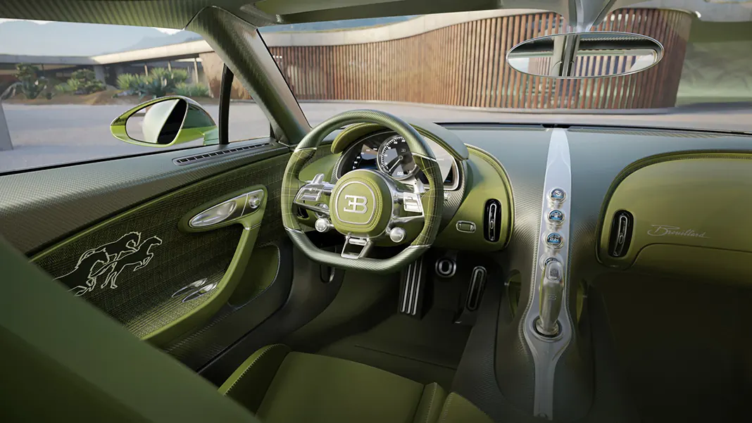 Своє ім’я штучний суперкар отримав на честь улюбленого коня Етторе Бугатті на прізвисько Бруйяр, що в перекладі означає «туман» — це слово добре гармонує з димчастим забарвленням тварини. Тим часом неназваний заможний замовник Bugatti Brouillard вибрав для своєї машини палітру кольорів з різними відтінками зеленого. Цей колір помітний у тому числі в структурі всіх вуглепластикових деталей автомобіля.