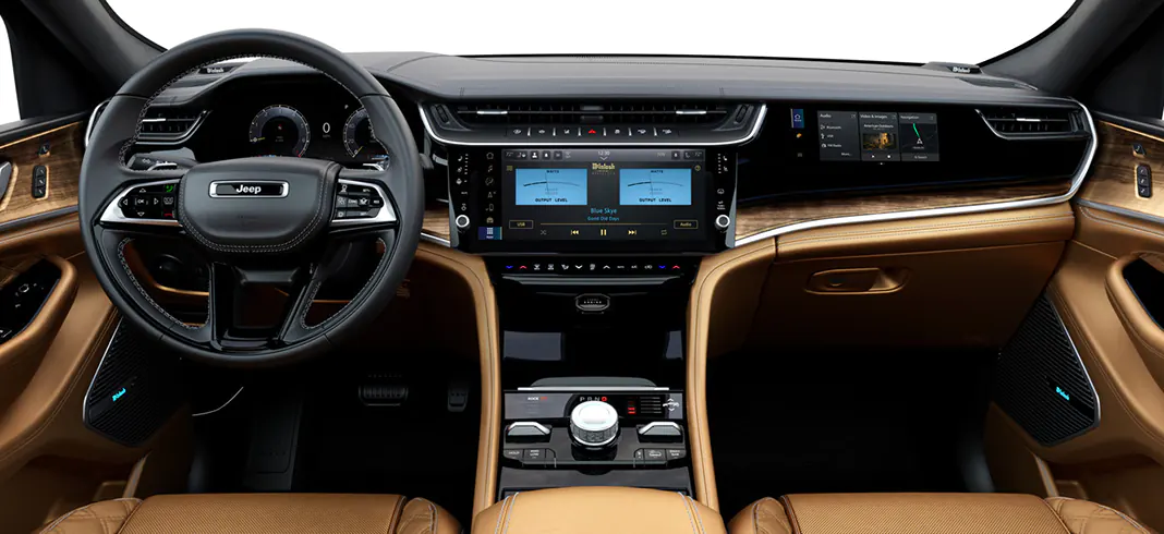 У салоні рестайлінгового Jeep Grand Cherokee також є оновлення. Так, позашляховик отримав переглянуту передню панель, а також більший екран інформаційно-розважальної системи: тепер 12,3 дюйма замість дисплеїв на 8,4 та 10,1 дюйма у попередньої версії. Ще у нової моделі інакше оформлений блок управління кліматичною установкою.