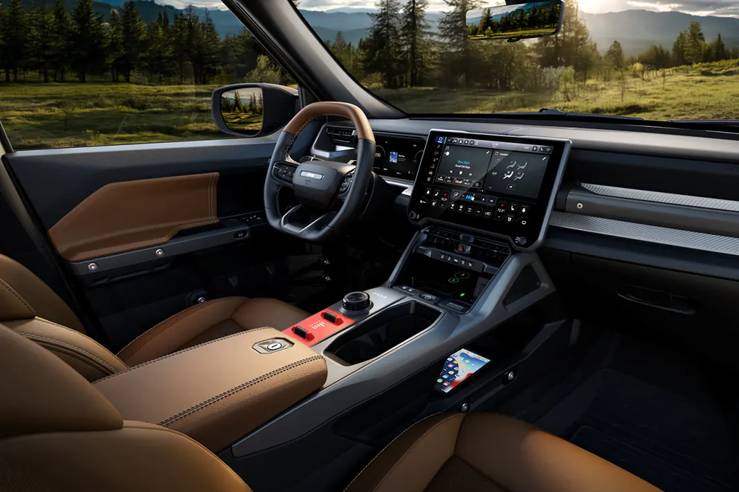 На передній панелі розташований віртуальний щиток приладів діагоналлю 12,3 дюйма, а по центру встановлений планшет інформаційно-розважальної системи Uconnect 5, його діагональ дорівнює 14,5 дюйма. Нижче можна побачити пристрій для бездротового заряджання смартфонів.