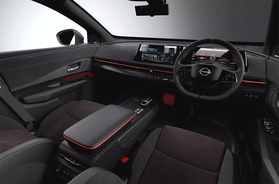 Спереду такий Ariya має подовжений спліттер з фірмовим червоним акцентом. Червоною смугою також підкреслені пороги та корпуси дзеркал. Ззаду зміни, мабуть, найпомітніші: від Nismo кросоверу дістався більший козирок на даху та спойлери на задніх дверях, глянсовий чорний бампер і нові, міцніші алюмінієві диски розмірністю 20 дюймів. Завдяки аеродинамічному пакету покращилася притискна сила на високих швидкостях.