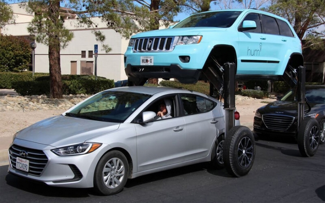 Американские ученые фирмы Thinkmodo разработали конструкцию, которая встроена в шасси автомобиля и поднимает его вверх на три метра. Творение Hum Rider имеет уникальную гидравлическую систему, включающую в себя стойки, помогающие автомобилю подняться.