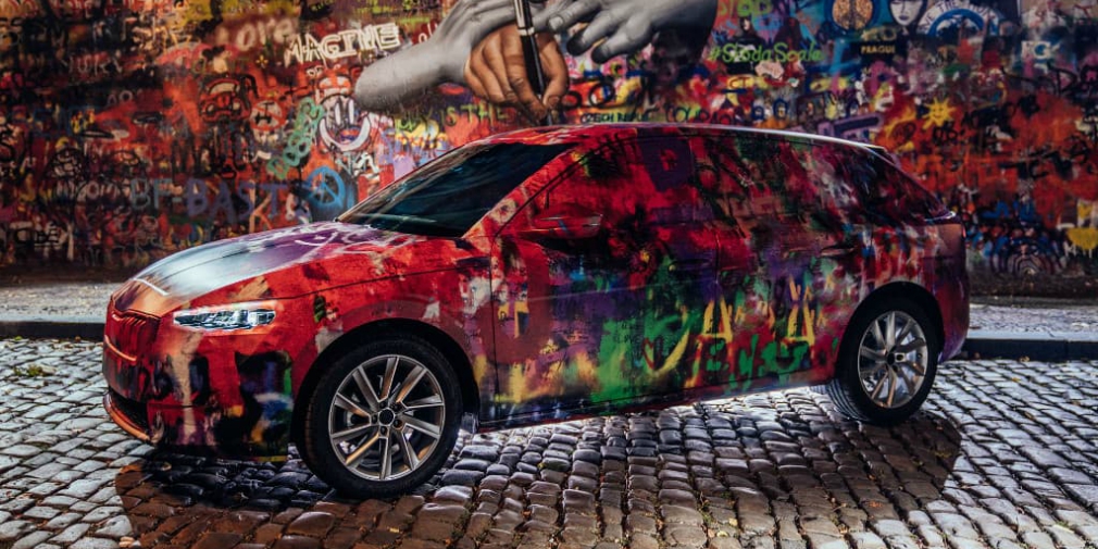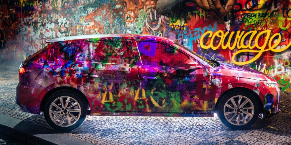 Новинка получила уникальный камуфляж от известного в Праге уличного художника под псевдонимом Chemis, который также специализируется на создании трехмерных граффити. Автор раскрасил хэтчбек, как будто рисунки накладывались один на другой в течение многих лет, как на стене Леннона.