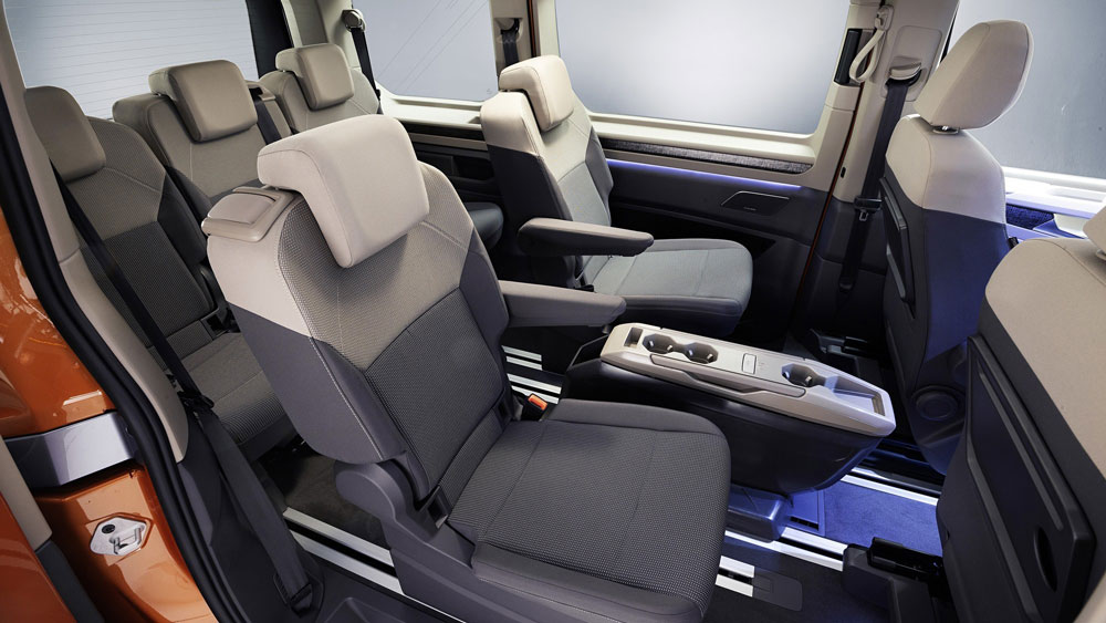 Volkswagen T7 трохи нижче і ширше, ніж Т6.1. В цілому місця в ньому приблизно стільки ж, але простір всередині організовано краще. Сидіння легше на 25%, до того ж в третьому ряду встановлена не цільна лава, а три роздільних крісла – демонтувати їх і вийняти з салону зможе навіть домогосподарка. Передня панель схожа на ту, що вже є у Т6.1, але якість оздоблювальних матеріалів вища, а селектор АКП («механіки» не передбачено) скорочений до розміру комп’ютерної флешки і не заважає переміщенню між сидіннями.
