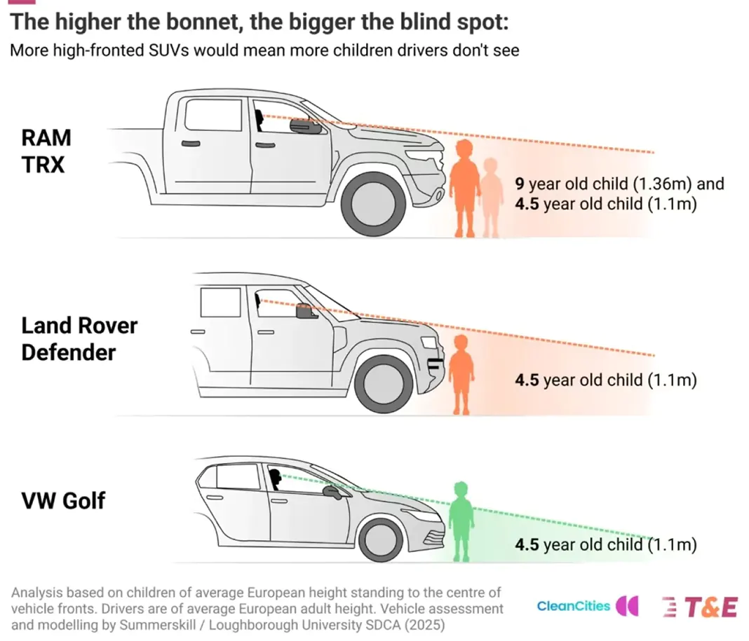 Схема показує, що чим вищий капот автомобіля, тим більша «сліпа зона» перед ним. У великого пікапа водій може не бачити навіть дитину приблизно 9 років (близько 1,36 м), яка стоїть прямо перед машиною. У великого позашляховика водій може не помітити молодшу дитину близько 4−5 років (приблизно 1,1 м). У нижчого легкового авто така сліпа зона значно менша, тому водій бачить дитину перед автомобілем.