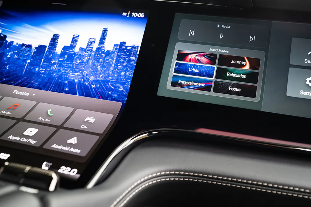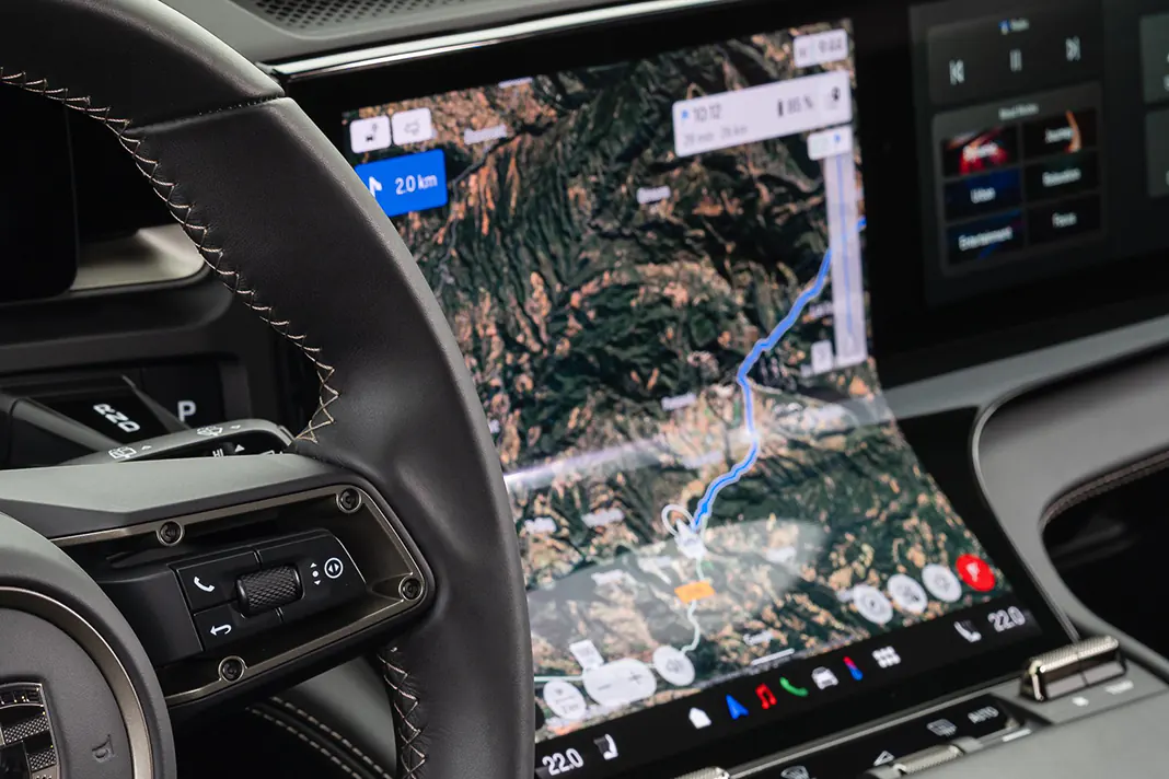 По-перше, тебе зустрічають елегантні безрамкові вікна. По-друге –спортивні шкіряні крісла, які фактично обіймають водія завдяки можливості налаштувати бічну підтримку під будь-яку статуру водія.  Сидіти дуже зручно. Ну і по-третє – великий вигнутий OLED-екран по центру. Напевно, це головна «фішка» інтер’єру електричного Cayenne, і про неї варто розповісти більше.