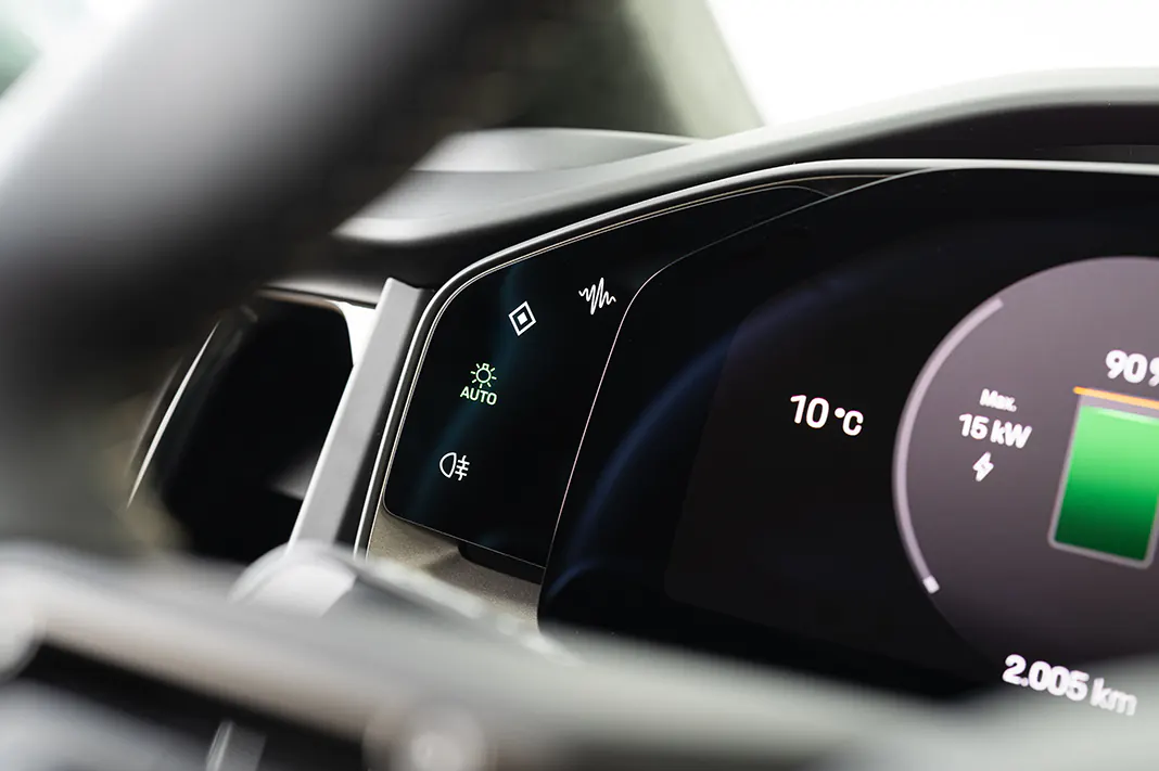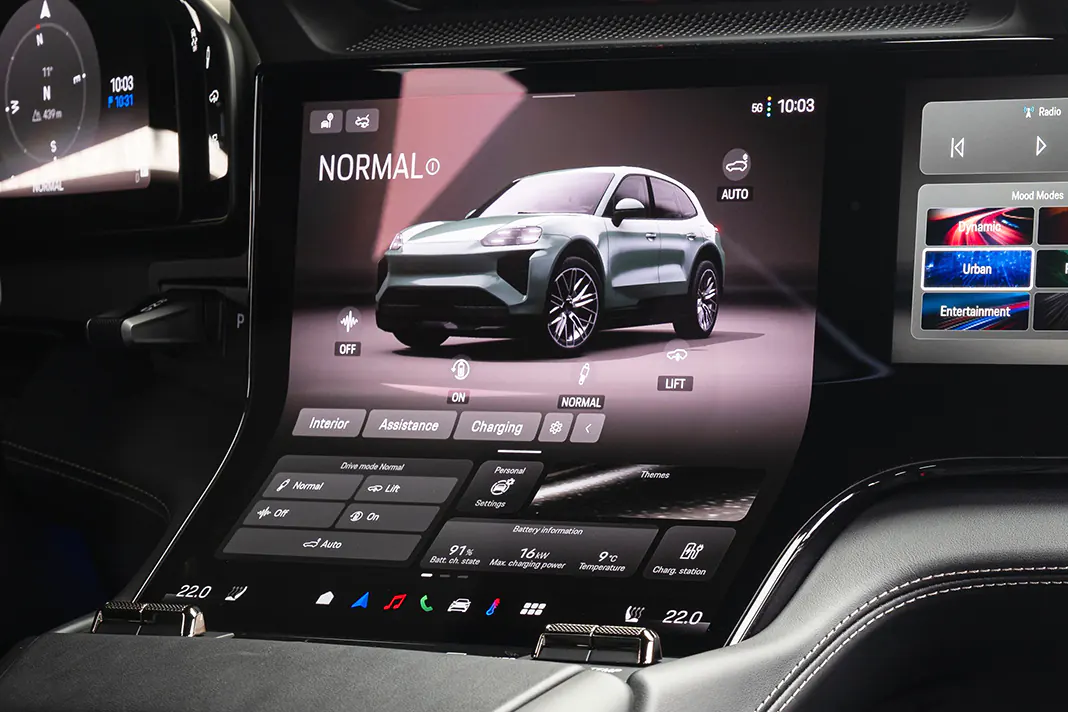І це, до речі, далеко не вся дисплейна «начинка» електричного Cayenne. Перед пасажиром також є екран (14,9 дюйма, опція), який водій не бачить під час руху, а за кермом – цифрова панель приладів на 14,25 дюйма. У неї доволі проста, зрозуміла та якісна графіка, а по боках є декілька сенсорних кнопок (хоча спочатку здавалося, що це лише піктограми) – світло, режим руху, ESP тощо. З одного боку, добре, що вони є, а з іншого – після користування ними на глянсовій поверхні залишаються неохайні сліди від пальців.