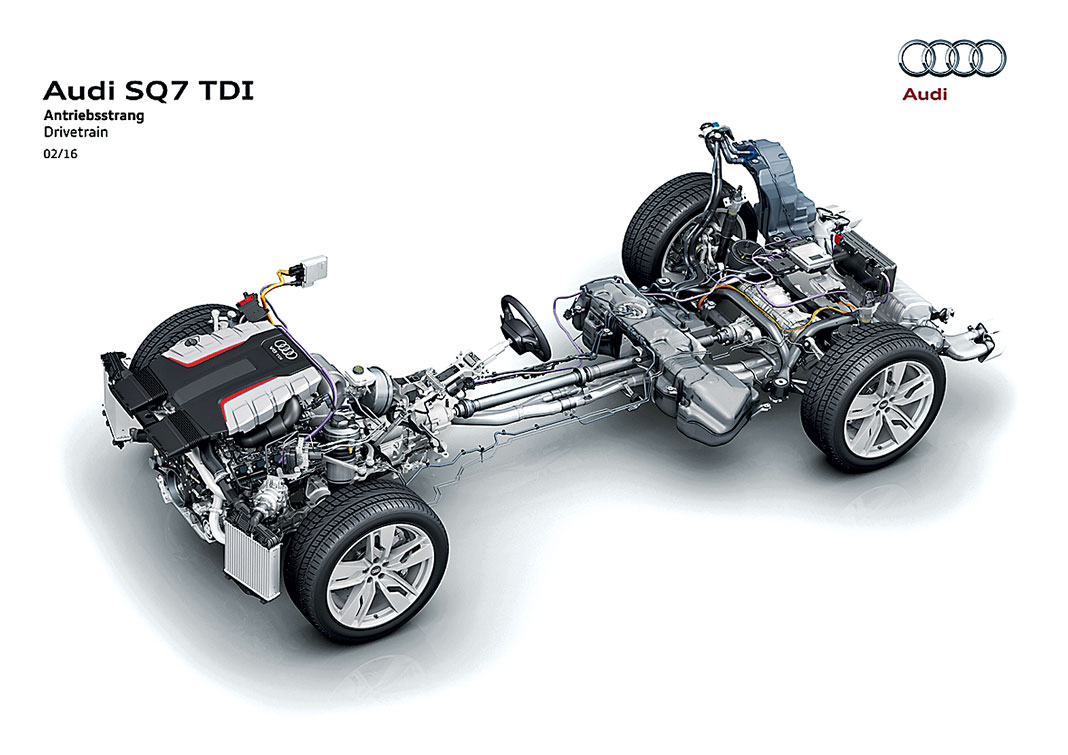 Но визитная карточка SQ7 – это все-таки не плеяда ассистентов, а новейший 4-литровый дизельный V8 с тройным наддувом. Именно этот агрегат лучше всего демонстрирует технологическое совершенство спортивного кроссовера Audi. Новая «восьмерка» – это первый в мире дизельный мотор, в конструкции которого применяется компрессор с электрическим приводом. Он вступает в работу, как только водитель нажимает на педаль акселератора, и нагнетает воздух в цилиндры до тех пор, пока от энергии отработавших газов не раскрутится второй, обычный, турбонагнетатель. Дальше, примерно до 2500 об/мин, именно второй нагнетатель обеспечивает наддув. А затем параллельно со второй в дело вступает третья турбина, и вместе они работают до самой отсечки. Причем для задействования третьей турбины предусмотрены свои индивидуальные выпускные клапаны с электронным управлением, которые при небольших нагрузках просто не открываются.