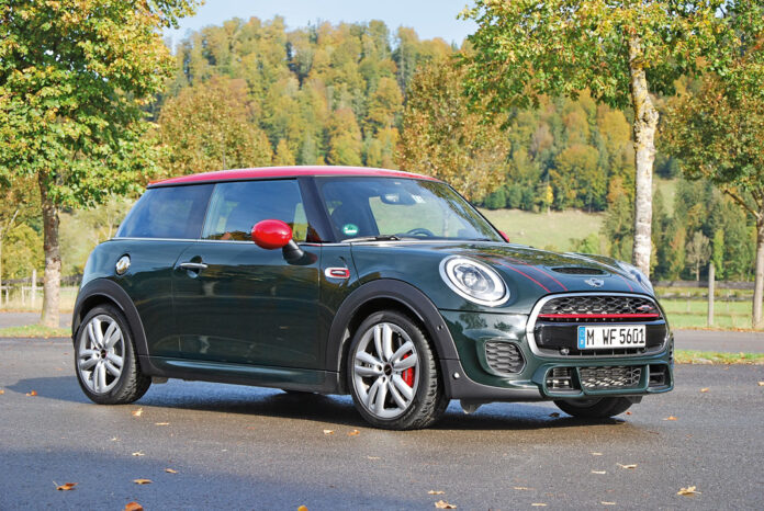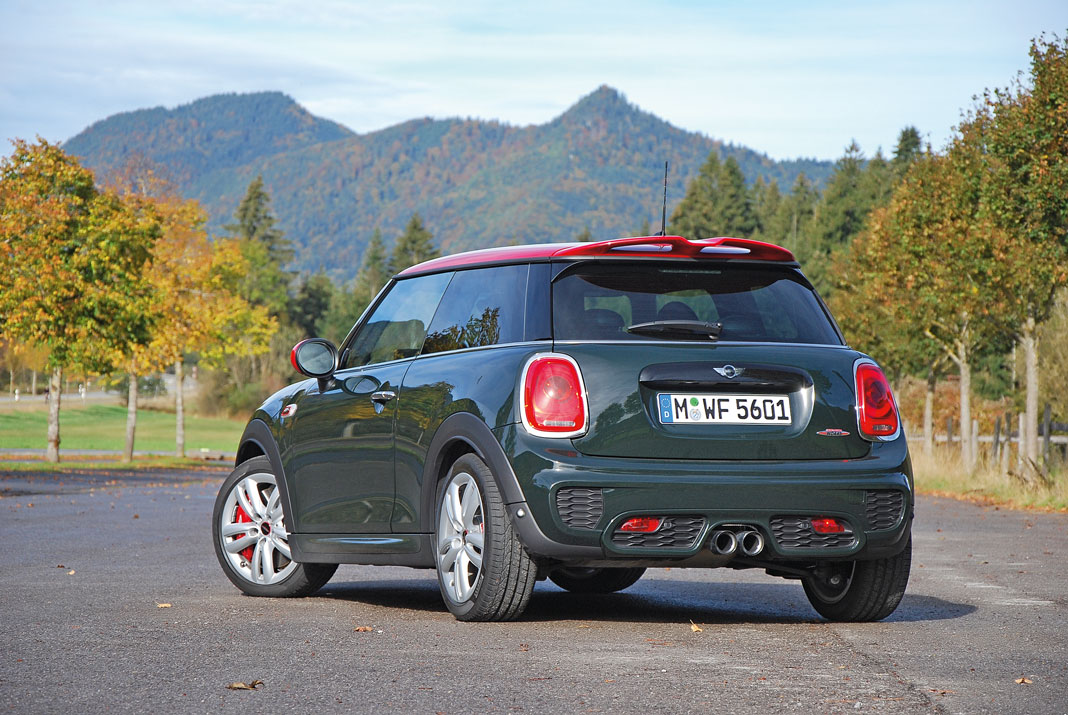 Признаться, рассмотреть детали его экстерьера удалось не сразу. Мы встретились на парковке аэропорта, и вот уже броский MINI JCW мчит нас по направлению к австрийским Альпам. Бутылочно-зеленый цвет кузова именуется British Racing Green. Многообещающе – и в то же время как гармонично смотрится этот MINI в теплых красках осени. Однако красная крыша и алые элементы декора, как и любой красный цвет в природе, символизируют притаившуюся опасность.