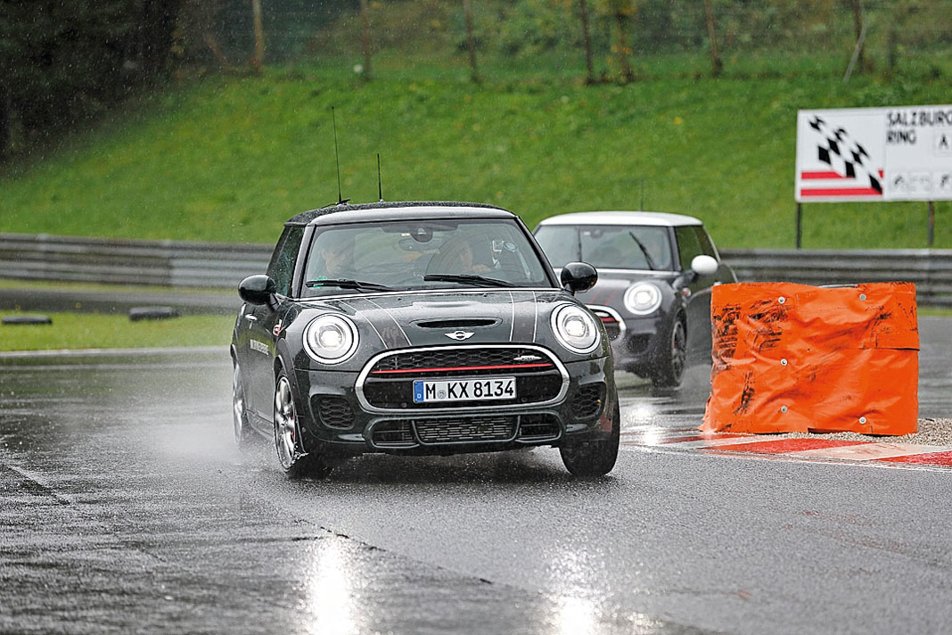 Когда мы добрались до Зальцбургринга, над ним разразился ливень. Не просто моросящий ленивый осенний дождь – настоящие потоки воды. И как мы теперь тут будем гонять? Осторожно! Инструкторы водительской школы BMW Driving Experience настоятельно не рекомендовали заигрывать с законами физики и не надеяться на то, что инженеры MINI победили действие центробежных сил в затяжных профилированных виражах.