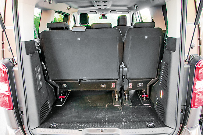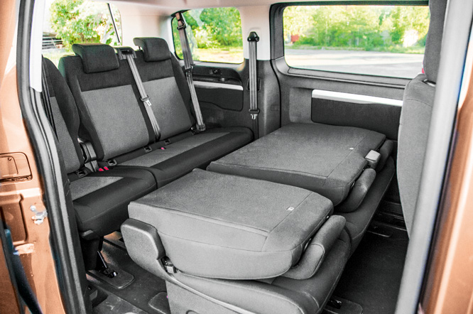 Салон можно покритиковать за обилие жесткого пластика и отсутствие салазок для кресел второго и третьего рядов. Кроме того, понадобятся грубая мужская сила, чтобы демонтировать кресла из машины, и место, куда их можно сложить. Зато потом Peugeot Traveller можно превратить в передвижной мини-отель и с комфортом заночевать вдвоем, а то и втроем. Габариты салона позволяют «вытянуть ноги» даже баскетболисту. А ведь у нас был стандартный вариант длиной 4956 мм, а есть еще Traveller L3 с удлиненным на 350 мм кузовом (колесная база в 3275 мм неизменна).