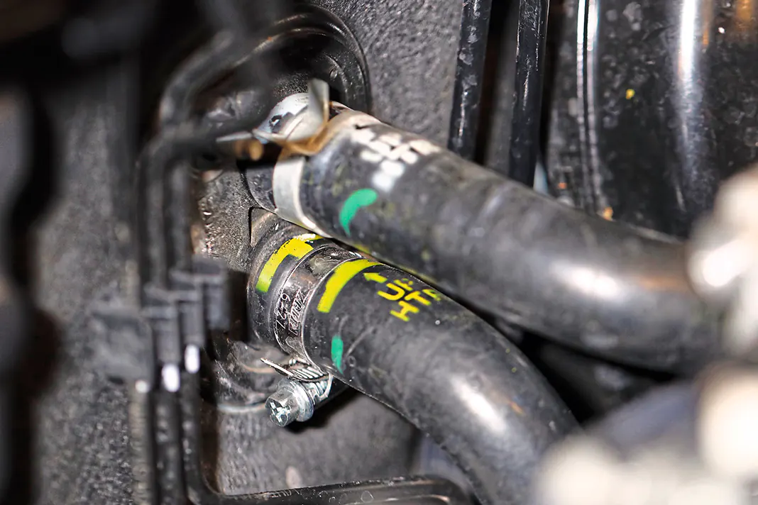 Під час візиту до сервісу Kia одна виявлена деталь здалася дуже дивною. Механіки перевірили шланги теплообмінника. У стандарті тут мають бути встановлені дві хомутні стяжки, тоді як у нашому Sportage було лише одне кріплення. До того ж замість хомута був використаний інший затискач. Чи не інша СТО виявила витік води в цьому місці й замінила затискач?